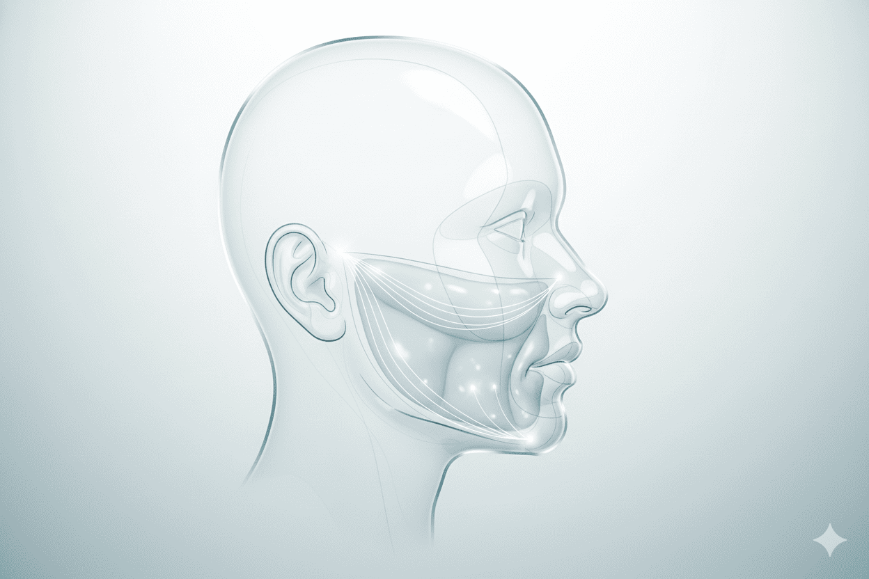 バッカルファットは、皮下脂肪よりもさらに奥、筋肉(咬筋や頬筋)の内側にある脂肪の塊です。こめかみから頬にかけての深い部分に細長く存在しています。