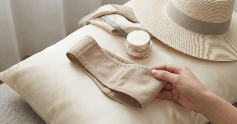 バンドの上部が見えてしまう場合は、つばの広い帽子やワイドタイプのヘアバンドを重ねると効果的です。サポーターの色に近いベージュやブラウン系のヘアバンドを選ぶと、境目が目立ちにくくなります。